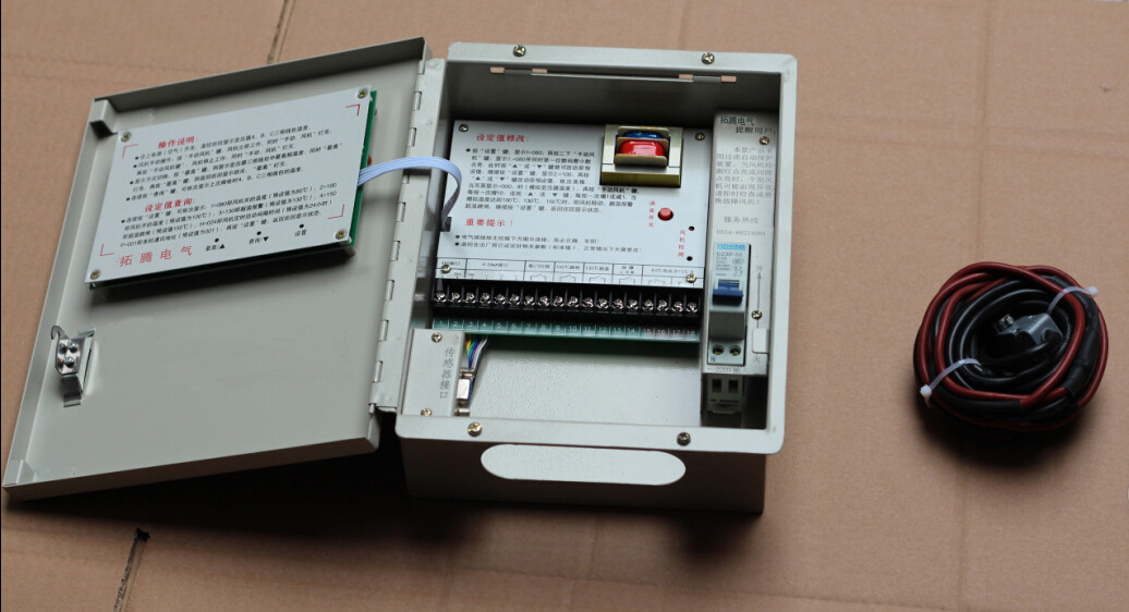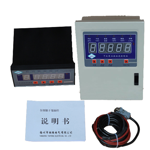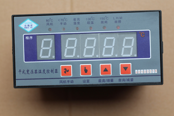 三、主要功能及操作方法1.最高相切換功能: 當(dāng)溫控器正常巡回顯示三相溫度時(shí),按下“▲”鍵,即顯示三相中最高相溫度,同時(shí)面板上“最高”燈亮,再按一下“▲”鍵,“最高”燈滅,返回正常巡回顯示狀態(tài)。 2.風(fēng)機(jī)手動(dòng)控制功能: 當(dāng)三相中的最高相溫度低于設(shè)定的關(guān)風(fēng)機(jī)溫度時(shí),按一下“手動(dòng)風(fēng)機(jī)”鍵,風(fēng)機(jī)運(yùn)轉(zhuǎn),面板上“手動(dòng)”燈亮,“風(fēng)機(jī)”燈亮,再按一下“手動(dòng)風(fēng)機(jī)”鍵,風(fēng)機(jī)停止運(yùn)轉(zhuǎn),同時(shí)“手動(dòng)”燈滅,“風(fēng)機(jī)”燈滅,此功能可作為檢測風(fēng)機(jī)的運(yùn)行質(zhì)態(tài)。 3.風(fēng)機(jī)自動(dòng)啟、停功能: 當(dāng)三相中的最高相溫度達(dá)到設(shè)定的開風(fēng)機(jī)溫度時(shí),風(fēng)機(jī)運(yùn)行,同時(shí)面板上“風(fēng)機(jī)”燈亮。冷卻一段時(shí)間后,當(dāng)三相中的最高相溫度降到設(shè)定的關(guān)風(fēng)機(jī)溫度時(shí),風(fēng)機(jī)停止運(yùn)行,同時(shí)“風(fēng)機(jī)”燈滅。另外還具有風(fēng)機(jī)自動(dòng)定時(shí)啟動(dòng)功能(1-256小時(shí)任意設(shè)置,當(dāng)設(shè)置000時(shí),表示該功能被取消),自動(dòng)啟動(dòng)時(shí),風(fēng)機(jī)運(yùn)行時(shí)間約2分鐘。 4.超溫報(bào)警功能: 當(dāng)三相中的最高相溫度達(dá)到設(shè)定的超溫報(bào)警溫度時(shí),面板上“超溫”燈亮,主控板上的蜂鳴器報(bào)警,同時(shí)通過主控板上的端子輸出開關(guān)信號—即超溫信號。 5.超高溫跳閘功能: 當(dāng)三相中的最高相溫度達(dá)到設(shè)定的超高溫跳閘溫度時(shí),面板上“跳閘”燈亮,主控板上的蜂鳴器報(bào)警,同時(shí),通過主控板上的端子輸出開關(guān)信號—即跳閘信號。(注為防止偶然因素引起的誤跳閘,特將跳閘信號延時(shí)5秒)。 6.故障檢測功能: 當(dāng)傳感器三相中有一相或兩相短路(顯示L)或開路(顯示H)時(shí),面板上“故障”燈亮,主控板上的蜂鳴器報(bào)警,同時(shí)通過主板上的端子輸出開關(guān)信號—即故障信號;當(dāng)傳感器三相全部短路(三相均顯示L)或全部開路(三相均顯示H)時(shí),風(fēng)機(jī)強(qiáng)行啟動(dòng),面板上的“故障”燈亮,主控板上的蜂鳴器報(bào)警,同時(shí)通過主控板上的端子輸出開關(guān)信號號—即故障信號;當(dāng)干式變壓器保護(hù)箱的柜門被打開時(shí),面板上的“故障”燈亮,主控板上的蜂鳴器報(bào)警,同時(shí),通過主控板上的端子輸出開關(guān)信號 即故障信號(注:主控板上柜門行程的輸入時(shí)通過柜門上的行程開關(guān)或按壓開關(guān)連接的)。 7.參數(shù)查閱功能: 連續(xù)按“設(shè)置”鍵,可依次顯示1=080即風(fēng)機(jī)關(guān)的溫度(預(yù)設(shè)值為80℃),2=100即風(fēng)機(jī)開的溫度(預(yù)設(shè)值為100℃);3=130即超溫報(bào)警(預(yù)設(shè)值為130℃);4=150即超溫跳閘(預(yù)設(shè)值為150℃);H=024即風(fēng)機(jī)定時(shí)起動(dòng)間隔時(shí)間(預(yù)設(shè)值為24小時(shí));P=001即本機(jī)通訊地址(預(yù)設(shè)值為001;再按“設(shè)置”鍵,返回巡回顯示狀態(tài)。 8.參數(shù)修改功能: 按“設(shè)置”鍵,顯示1=080,再按三下“手動(dòng)風(fēng)機(jī)”鍵,顯示1=080并同時(shí)第一位數(shù)碼管小數(shù)點(diǎn),此時(shí)按“▲”或“▼”鍵可改動(dòng)原預(yù)設(shè)值;繼續(xù)按“設(shè)置”鍵,顯示2=100,再按“▲”或“▼”鍵改動(dòng)原預(yù)設(shè)值;依次類推……當(dāng)頁面顯示=000時(shí),(模擬變壓器溫度)再按“手動(dòng)風(fēng)機(jī)”鍵,每按一次增10,或按“▲”或“▼”每按一次增1或減1,當(dāng)模擬溫度達(dá)到100、130、150時(shí),即風(fēng)機(jī)轉(zhuǎn)動(dòng)、超溫報(bào)警、超溫跳閘;繼續(xù)按“設(shè)置”鍵,返回巡回顯示狀態(tài)。(注:修改參數(shù)時(shí),溫控自動(dòng)保證關(guān)風(fēng)機(jī)溫度<開風(fēng)機(jī)溫度<超溫報(bào)警溫度<超高溫跳閘溫度,并且最小間隔為5℃)。 9.模擬檢測功能: 用手動(dòng)的方式輸入變壓器模擬溫度值來檢測對應(yīng)的控制功能,具體參照“參數(shù)修改功能”中的頁面=000(模擬變壓器溫度)操作。 10.“黑匣子”功能: 可記錄干式變壓器掉電時(shí)的三相溫度值,為避免變壓器通電后再次掉電而改變記憶數(shù)據(jù),規(guī)定斷電前溫度低于80℃時(shí)不刷新新原記錄溫度,查詢方式:連續(xù)按“查詢”鍵,可依次顯示上次掉電時(shí)A、B、C、三相溫度值。 11.通訊功能: 本機(jī)可增加RS485通訊功能。 12.過流、過載保護(hù)功能: 當(dāng)風(fēng)機(jī)回路電流過大或短路時(shí)保險(xiǎn)絲5A熔斷或DZ237空氣開關(guān)自動(dòng)脫扣。特別提示:當(dāng)出現(xiàn)上述情況時(shí),不要急于更換保險(xiǎn)絲或合上空氣開關(guān),一般情況下是個(gè)別風(fēng)機(jī)卡殼短路所導(dǎo)致。解決方法:更換風(fēng)機(jī)或臨時(shí)拆除故障風(fēng)機(jī)電源線即可! 13.模擬量輸出功能: 具有4-20mA模擬量輸出功能并對應(yīng)0-200℃。 四、產(chǎn)品型號及對應(yīng)功能