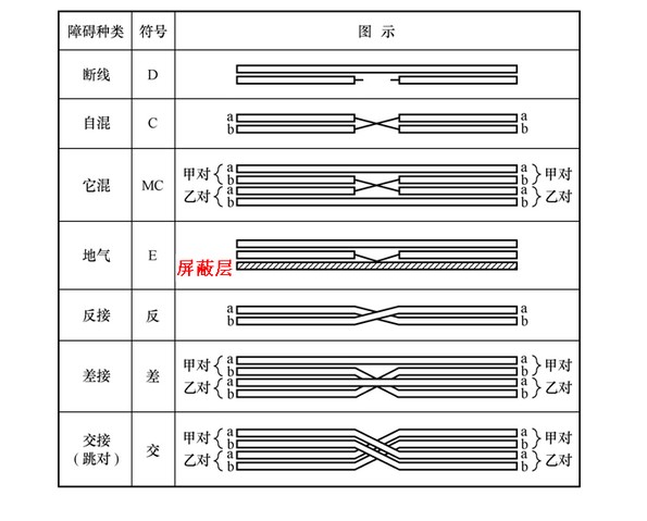①斷線:電纜芯線斷開。 ②混線:芯線相碰觸(又名短路) 。本對線間相碰為自混;不同線對 間芯線相碰為它混。 ③地氣:芯線與金屬屏蔽層(地)相碰,又稱接地。 ④反接:本對芯線的a、b線在電纜中間或接頭中間錯接。 ⑤差接:本對芯線的a(或b)線錯與另一對芯線的b(或a)線相接, 又稱鴛鴦對。 ⑥交接: 本對線在電纜中間或接頭中間錯接到另一對芯線, 產(chǎn)生錯號, 又稱跳對