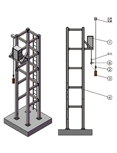 多功能高空墜落試驗(yàn)系統(tǒng)組成 1.高空墜落用提鎖機(jī) 2.無線釋放器 3.無線激光測距重塊 4.多工位墜落試驗(yàn)架 5.標(biāo)準(zhǔn)模擬人(智能測量模擬人) 6.無線(有線)沖擊力測量儀