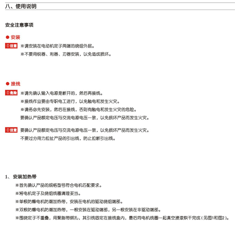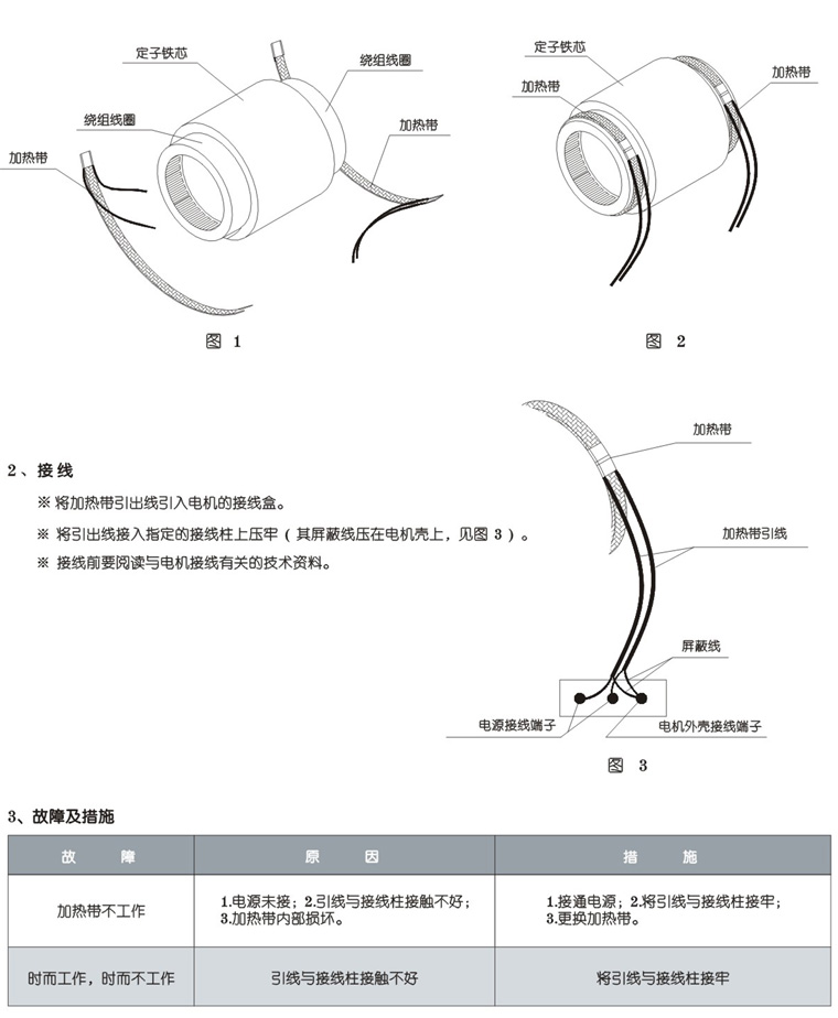 電機防潮加熱帶概述:電機由于潮濕、結(jié)露、結(jié)霜等原因,容易造成電氣設(shè)備絕緣性能下降,引發(fā)電氣故障。BQ系列防潮加熱帶是專門針對以上情況設(shè)計研制及生產(chǎn)的產(chǎn)品,在電機不工作時防潮加熱帶工作,使電機繞組溫度始終高于環(huán)境溫度。從而避免線圈繞組結(jié)露;保證電機在潮濕環(huán)境里正常運行。