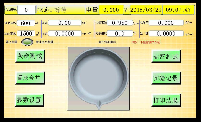 12、燒杯:凸型燒杯 14、相對濕度:85% 15、外形尺寸:長300mm X寬400mm X高300mm 16、重 量:5.0KG 四、操作界面圖示測試儀操作界面包括鹽密測試、灰密測試、微型打印機系統(tǒng)、觸屏人機交互系統(tǒng)和調(diào)制激光檢測系統(tǒng)