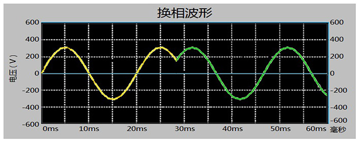 三、產(chǎn)品特點(diǎn) 1. 等電壓0毫秒無(wú)縫換相技術(shù),換相不中斷供電。 換相時(shí)間0毫秒,換相時(shí)間精準(zhǔn)可控。換相過(guò)程由電力電子器件完成,無(wú)機(jī)械觸點(diǎn)、不產(chǎn)生電弧;換相結(jié)束后由永磁開(kāi)關(guān)保持穩(wěn)態(tài),無(wú)損耗。 2. 換相過(guò)程無(wú)涌流,換相平穩(wěn)可靠。 由于換相時(shí)間為0毫秒,換相過(guò)程僅在兩相電壓相等的時(shí)刻相位跳變120°,屬于自然換相,因此無(wú)電壓突變、無(wú)涌流。