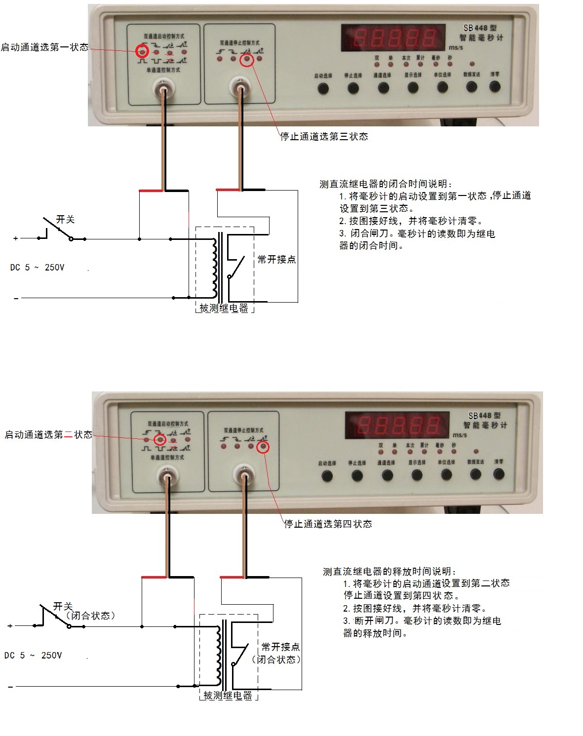 啟動端控制需要加一個雙擲閘刀,一刀控制繼電器線圈,另一刀接毫秒計,選第三個燈亮狀態(tài)。 交流不用電位控制,按下圖加雙擲閘刀,用空節(jié)點(第三個狀態(tài))即可。由于雙擲閘刀的閉合是同步的,所以繼電器線圈通電的同時,毫秒計就開始計時。繼電器的觸點閉合時,停止計時。