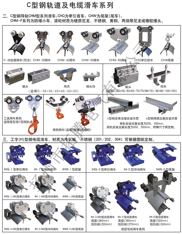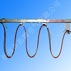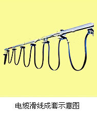 2、工作原理:扁平電纜的始端(接現(xiàn)場(chǎng)接線盒)固定于導(dǎo)軌的始端固定器上,再根據(jù)現(xiàn)場(chǎng)允許運(yùn)行的空間,間隔適當(dāng)?shù)拈L(zhǎng)度(1-2.5mm)依次固定在攜帶電纜的四輪臺(tái)車上,電纜未端(接用電源)固定在后一個(gè)小車(牽引車)上。通過拔車上的彈簧拔小車往復(fù)移動(dòng),通過電纜的拖拽(長(zhǎng)度如超過20m應(yīng)考慮原用牽引繩,使電纜免受拉力)作用,帶動(dòng)所有的小車在軋道中任意速度自由滑動(dòng),導(dǎo)軌安裝簡(jiǎn)便,無需調(diào)試,且無觸點(diǎn)接觸供電等優(yōu)點(diǎn),安全可靠。