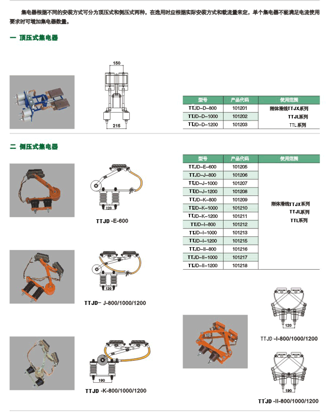 集電器根據(jù)不同的安裝方式可分為頂壓式和側(cè)壓式兩種,在選用時應(yīng)根據(jù)實際安裝方式和載流量來定,單個集電器不能滿足電流使用要求時可增加集電器數(shù)量。