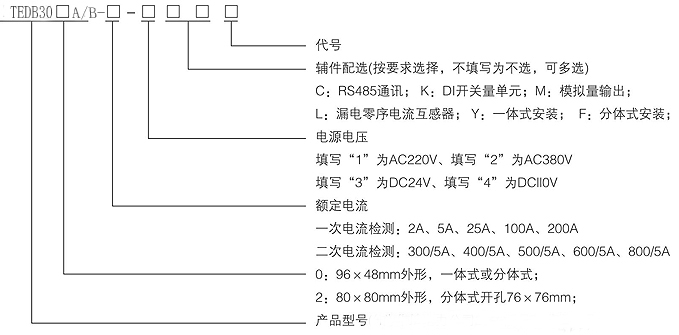 C-RS485通訊 B-模擬量輸出 D-開關(guān)量輸入單元(檢測接觸器狀態(tài)、外部故障、遠(yuǎn)程啟停)L-零序電流 |
