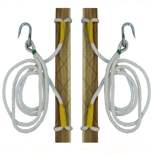 結(jié)構(gòu)特征是木踏板在兩側(cè)相應(yīng)位置切去與固定板相同厚度一塊,用固定板將繩索卡住并用木螺釘緊固在木踏板兩端的兩側(cè)面。徹底解決了繩索與木踏板上滑動(dòng)、滑脫的問題,具有結(jié)構(gòu)簡單,實(shí)用可靠的特點(diǎn)。