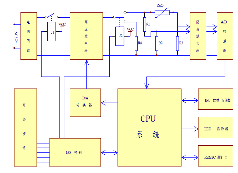 TZNR—50B氧化鋅閥片測試儀主要由以下幾部分組成:電源回路、壓發(fā)生器、放電回路、采樣隔離放大回路、A/D轉(zhuǎn)換器、D/A轉(zhuǎn)換器、CPU控制系統(tǒng)、數(shù)據(jù)存儲器、數(shù)碼顯示器、數(shù)據(jù)通信口、I/O控制口等幾部O閥片上,通過采樣電阻取得其動態(tài)V-A特性信號,經(jīng)隔離放大,由A/D轉(zhuǎn)換電路變換成數(shù)字信號,數(shù)據(jù)經(jīng)過分析處理后,其小電流V-A特性曲線數(shù)據(jù)被完整保存,并將結(jié)果數(shù)據(jù)用LED數(shù)碼管顯示。同時通過RS232通訊口與PC機連接交換數(shù)據(jù),完成對閥片測試數(shù)據(jù)的永久保存和數(shù)據(jù)曲線的顯示與打印,自動形成測試報告。