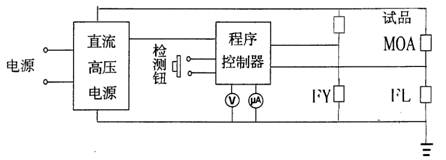 人工按一下檢測量鈕,便啟動(dòng)直流壓電源,由程序控制器從FL上采樣,產(chǎn)生nmA的恒流通過試品,經(jīng)FY自動(dòng)測量UnmA值,然后又由程序控制器發(fā)出指令產(chǎn)生0.5UnmA的恒定電壓加在試品上,進(jìn)而從FL上測得流過MOA的電流Id。
