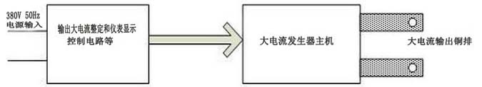 本產(chǎn)品輸入工作電源后,通過調(diào)整調(diào)壓器輸出低電壓以獲得試驗所需的大電流。其工作原理圖如下: